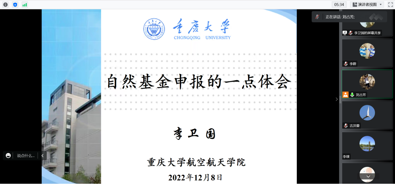 详情2022年12月8日下午3点, av01 在线上召开2023年度国家自然科学基金申报辅导会,邀请学院副院长(主持工作)李卫国为全院教师进行基金辅导。学院党委书记万玲、副院长刘占芳及全院教师50余人参会。会议由刘占芳主持。首先,李卫国教授简要介绍了学院近几年获批国家自然科学基金的情况,特别是今年学院获批国家自然科学基金14项,位居学校前列。随后,李卫国教授从自己多年申报基金的经验谈起,阐明了基金的重要性,鼓励老...