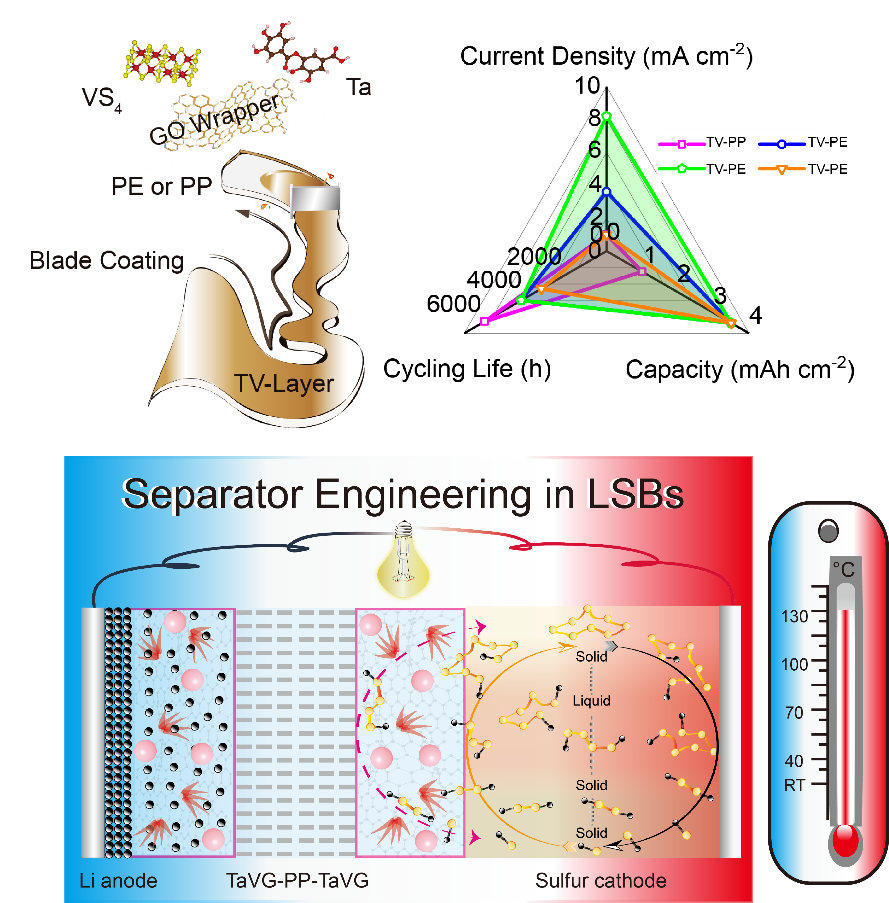 Recently, Prof. Xu’s group developed a composite separator by simply casting functional TV-layer on commercial polyolefin membrane to improve the Li+ transport behavior, modify SEI structure, and regulate the Li+ ion deposition, which result in dense cobblestone state rather than dendrites on the lithium terminal under long time cycling and high deposition capacity. Simultaneously, the functional layer facing the sulfur cathode shows targeted electrochemical catalysis towards sulfur species conversion. As a result, the designed separator enabled a dendrite-free Li anode for up to 6000 and 4200 h cycling for the TV-PP separator and TV-PE separator, respectively. The designed separator shows a wide compatibility in typical LMBs systems, not only achieving a high capacity of 3 mAh cm−2 after 150 cycles in LSBs, but also guaranteeing stable cycling performances in the full LIBs with commercial LFP and LMNCO-622 cathode. The soft-packaged thin batteries with the designed separator can stably cycle for 80 and 50 cycles with a LMNCO-622 and sulfur cathode, respectively. This separator engineering strategy solves the problems in LMBs from the perspective of electrochemical process initially at both lithium and sulfur cathode surface/interface. Additionally, the light weight (0.15 mg cm-2), mechanically stable (bearing up to 30 mAh cm-2 lithium deposition capacity without battery failure) and thermal tolerance (suffering 130 oC for 11 h without obvious thermal shrinkage) properties of the designed separator shows a wide practical application potential in future LMBs.