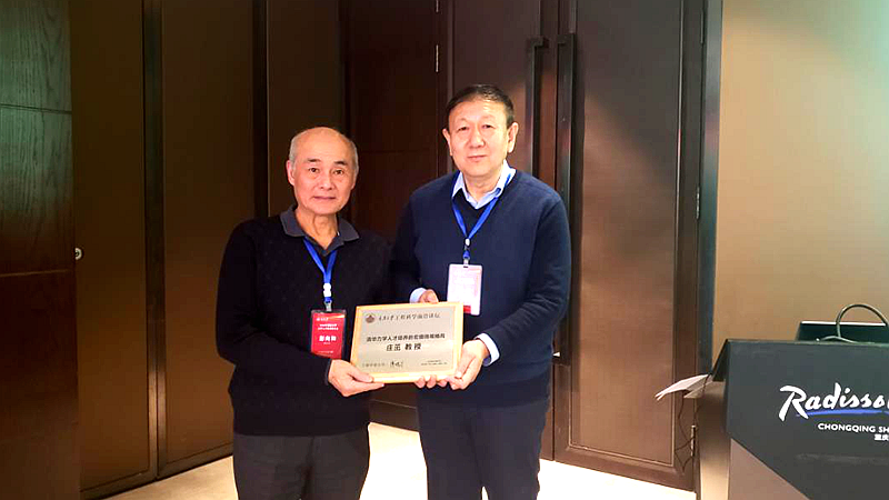 庄茁教授在随后的工程科学前沿讲坛中,以《清华力学人才培养的宏细微观格局》为题,通过清华大学力学学科对国家需求、学校发展、学科建设三个层面的定位和举措,详细介绍了清华力学人才培养的成绩与经验。报告结束后,彭向和教授代表工程学部为庄茁教授颁发了纪念奖牌。