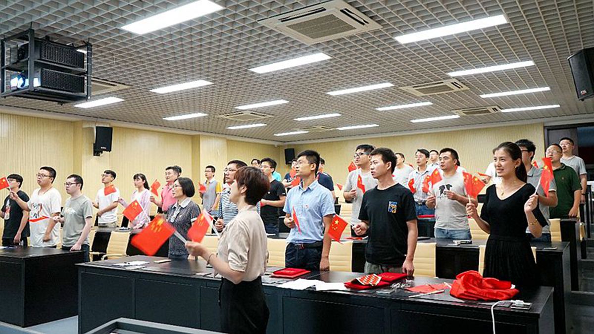 “我志愿加入中国共产党,拥护党的纲领,遵守党的章程,履行党员义务,执行党的决定,……”在鲜红的党旗下,程乐带领新党员宣誓,老党员重温入党誓词。