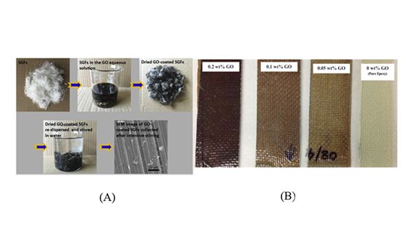 图3.(A)GO表面修身短玻璃纤维;(B)GO改性环氧树脂/玻纤复合材料。