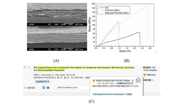 图1.具有仿贝壳结构的石墨烯复合材料的SEM照片(A)和应力-应变曲线(B),ESI高被引证明(C)。