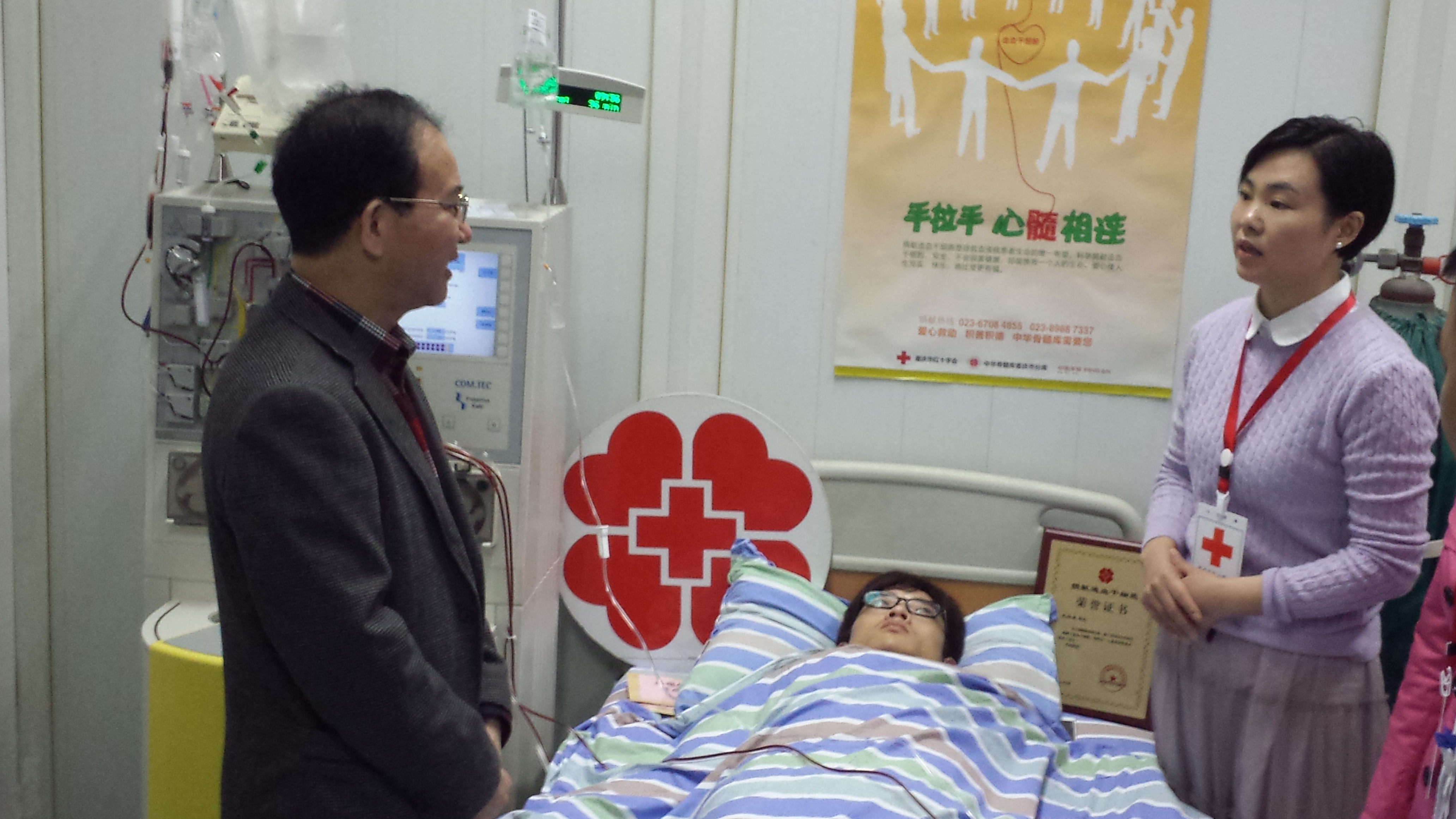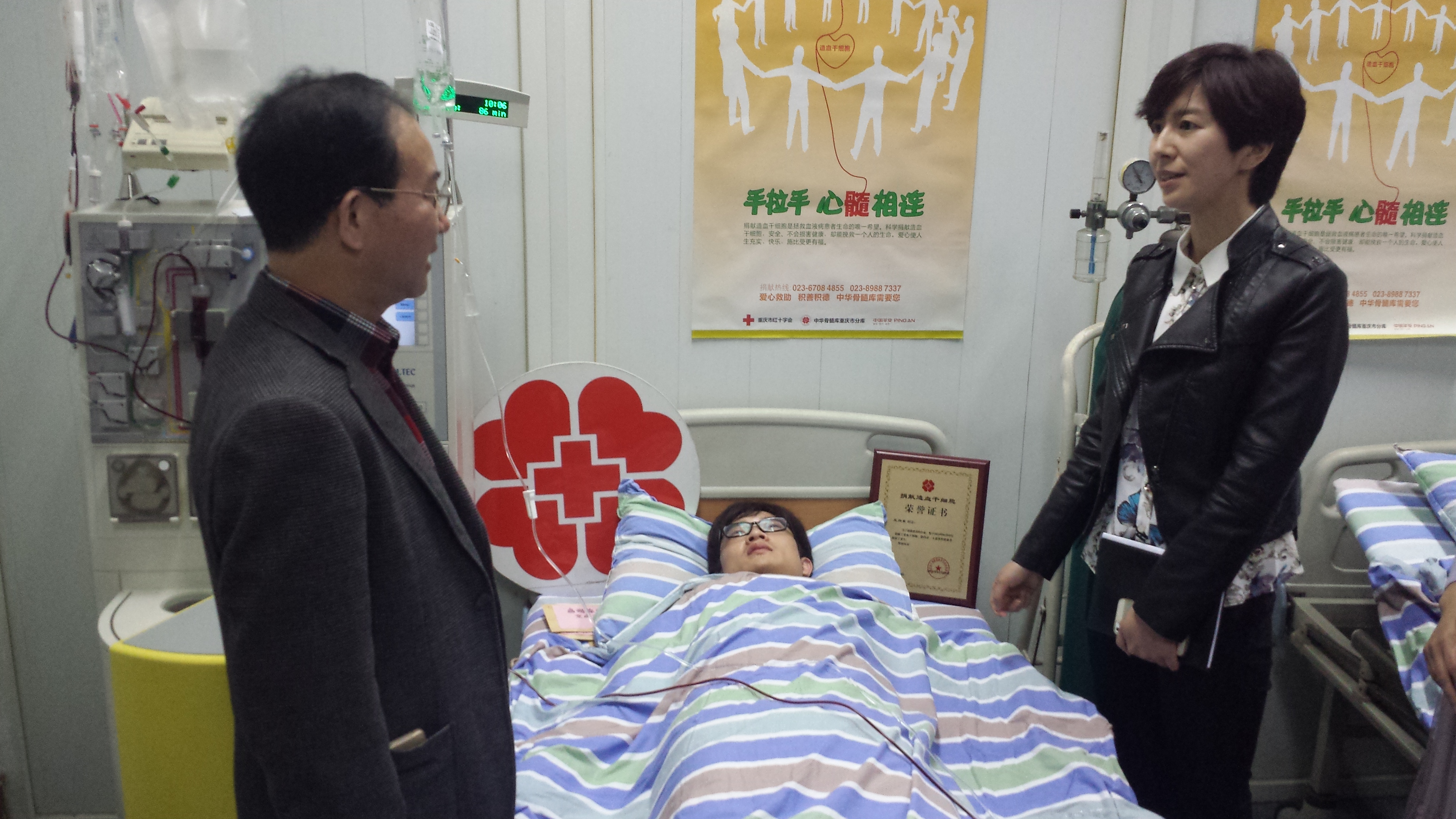的王向东同学,正在通过外周血循环捐献造血干细胞。他也成为了重庆市14年来第65位成功捐献造血细胞的志愿者,他的造血干细胞将被用于救治一位北京的白血病患者。