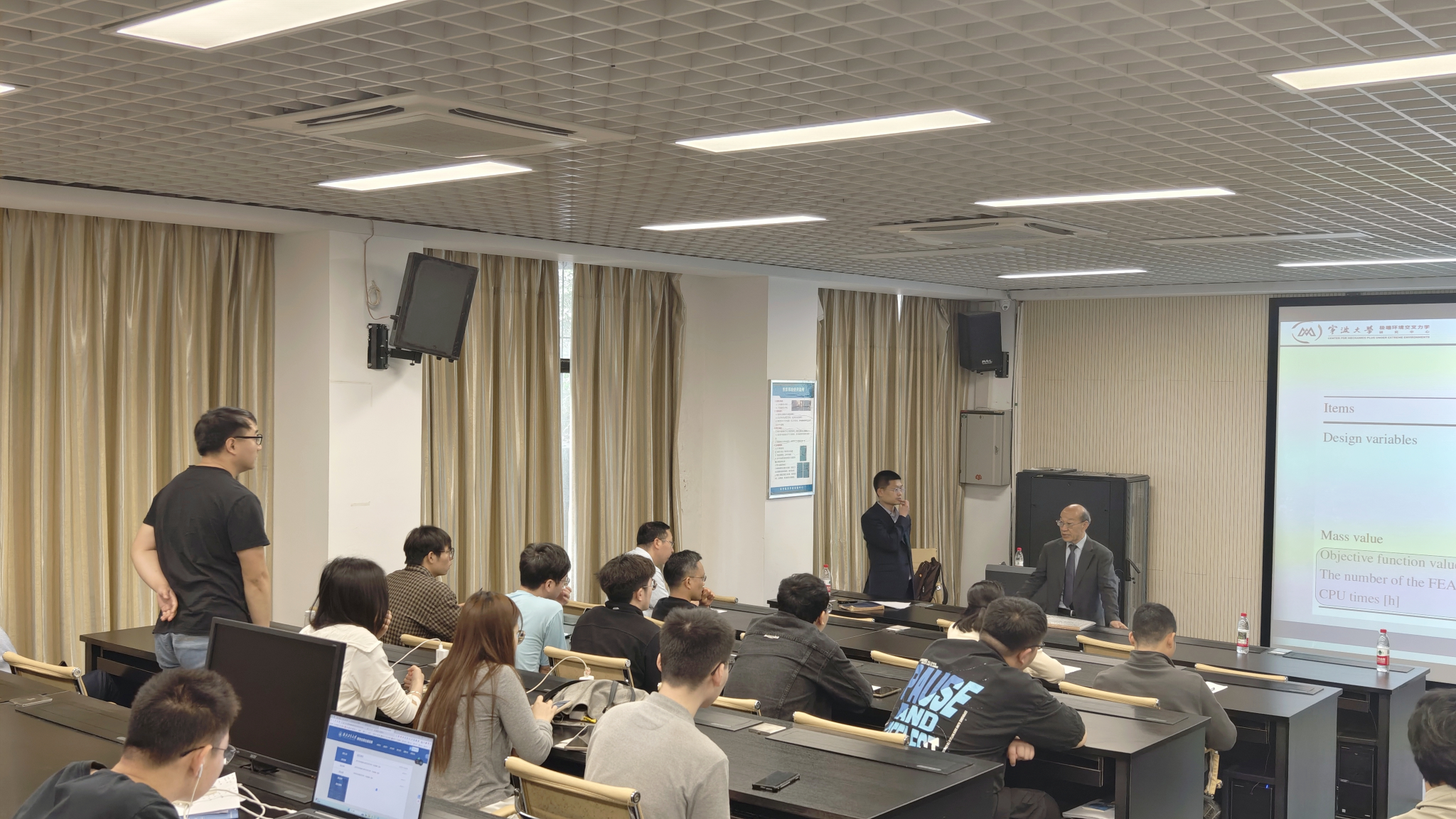 副院长陈立明教授主持,学院副院长(主持工作)李卫国教授、章俊教授、龚愉研究员、刘瑶璐副教授、成天宝副研究员、杨林运副研究员,以及工程学部师生50余人出席听讲。