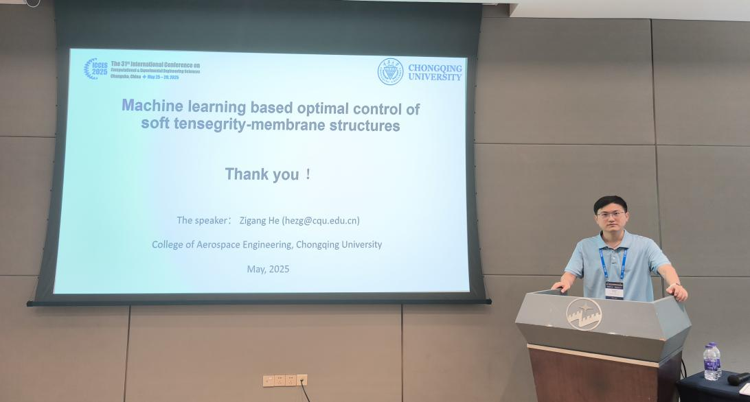 2021级力学博士生贺子刚(导师:张亮教授)赴湖南长沙参加高水平国际学术会议The 31st International Conference on Computational & Experimental Engineering and Sciences (ICCES2025),并作了题为“Machine learning based optimal control of soft tensegrity-membrane structures”的学术报告。经大会学术委员会评审,贺子刚被授予ICCES最佳学生论文奖。