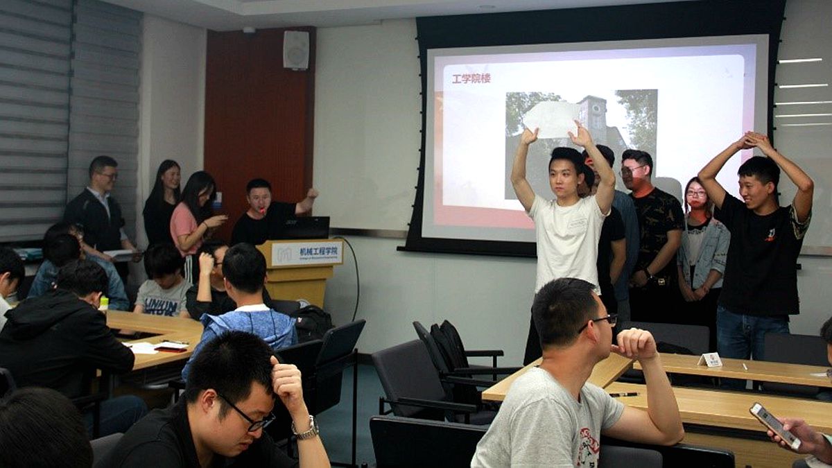 随后六个组翻牌抽取分享主题—校史中的优秀人物和知名建筑的典故,包括理学院楼、七七抗战大礼堂、工学院楼、马寅初与av01