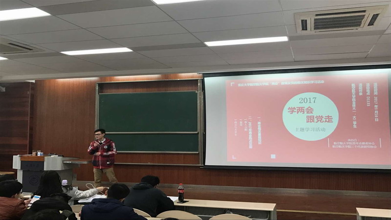 为了贯彻“两会”精神,落实“两会”行动,3月19日下午两点,在D1133由院三研会和青协开展的一次“学两会,跟党走”主题学习活动。航院2015、2016级全体学生参加本次活动,活动由青协副部长杨浩桢主持。