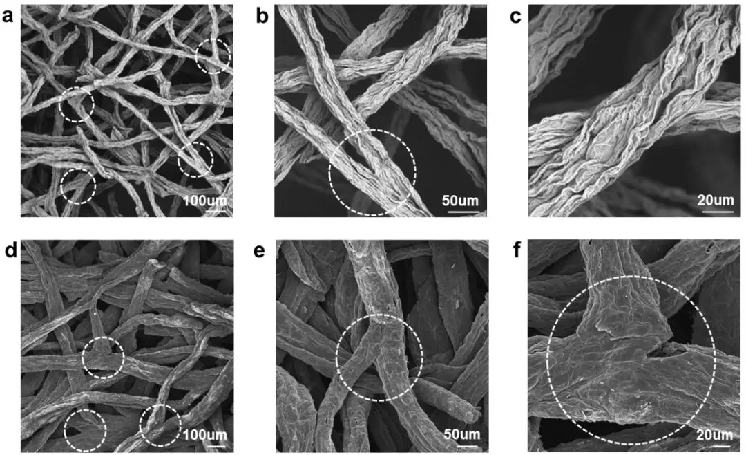由SEM图像可以清楚地看到,GOFF中每根纤维显示出粗糙表面,GO纤维的直径为35-45um。仔细观察还可以看出,GOFF中的GO纤维主要通过熔融或非熔融的纤维-纤维界面相互接触。经化学还原后,熔融或非熔融的纤维-纤维界面保存良好。值得注意的是,rGO纤维直径增加到80-100um。相对于GO纤维,rGO纤维直径的膨胀使得纤维之间界面接触更加紧密,这对于从低应变到高应变的高灵敏度压力传感器的开发非常有利。