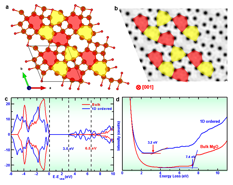 图3、DFT理论计算与STEM-EELS分析确定MgO一维有序晶体的原子与电子结构。MgO晶体是能隙为7.4 eV的绝缘体,MgO一维有序晶体则是能隙为3.2 eV的宽带半导体。