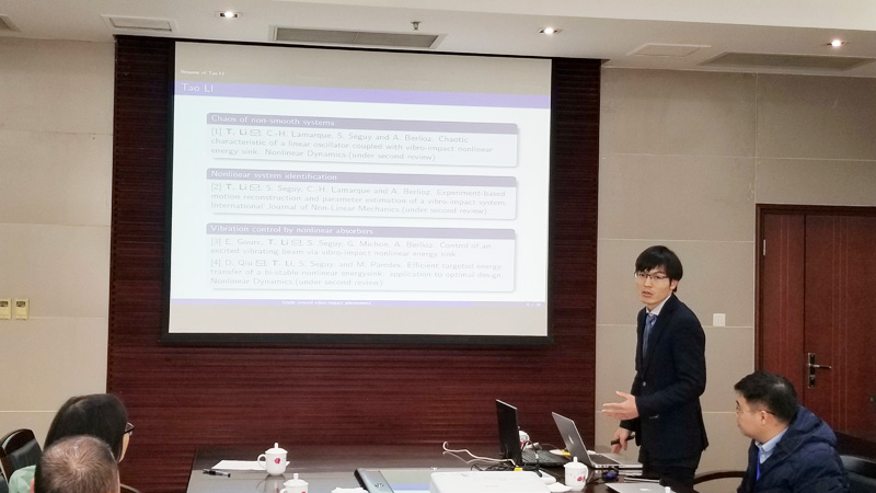 法国图卢兹大学的李滔博士主要围绕振动碰撞现象进行研究,他在报告《Study around vibro-impact phenomena》中介绍了振动碰撞非线性动力学领域的响应,分叉,阻尼器优化,混沌和非线性系统识别等,并就实验的各类细节问题与在场相关领域专家进行了深入讨论。