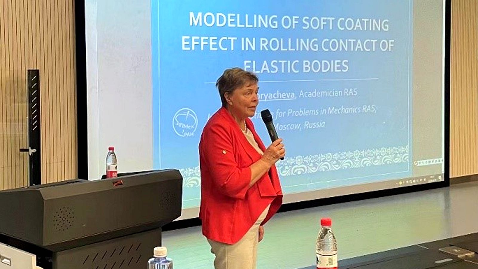 在报告中,Irina Goryacheva院士介绍了解决轴对称压头在覆盖有薄且可变形的涂层的弹性体上滚动和滑动接触问题的方法。采用了弹性模型和粘弹性模型来描述涂层的机械行为。通过对不同涂层的机械和几何特性进行接触和内部应力的计算,可以分析涂层对滚动和滑动接触中摩擦力的影响,以及其对疲劳裂纹形成的影响。