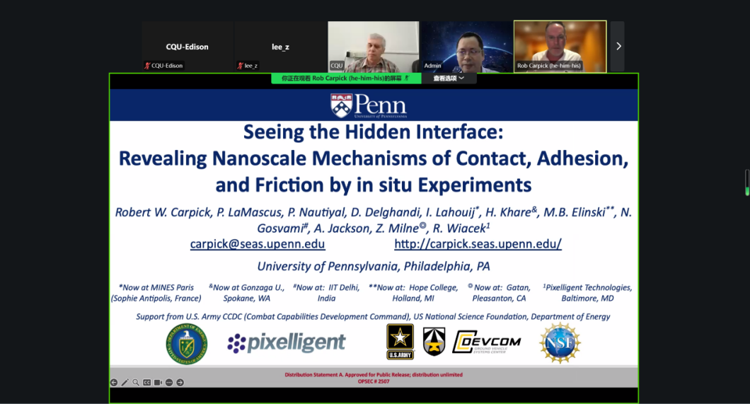 Robert Carpick教授的报告聚焦在原位实验方法揭示的新科学,这些方法促进了对摩擦学过程基于物理见解的发展。他研究发现,硅纳米微凸体之间的粘附呈现出强烈的、可逆的、滑动历史依赖性的特性,这归因于剪切诱导的化学吸附质的移除,随后在接触表面分离后迅速重新吸附。
