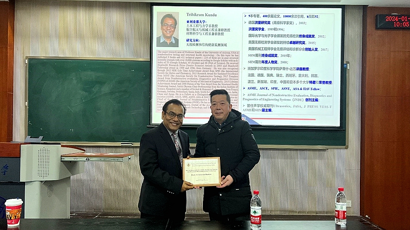 2024年1月3日,美国亚利桑那大学终身教授、洪堡学者Tribikram Kundu应邀访问av01 ,并在A区八教303教室出席工程学部主办的工程科学前沿讲坛,作了题为“无损检测和结构健康监测技术的最新进展”学术报告,报告由 av01 尹莘新助理研究员主持,工程学部师生五十余人出席听讲。