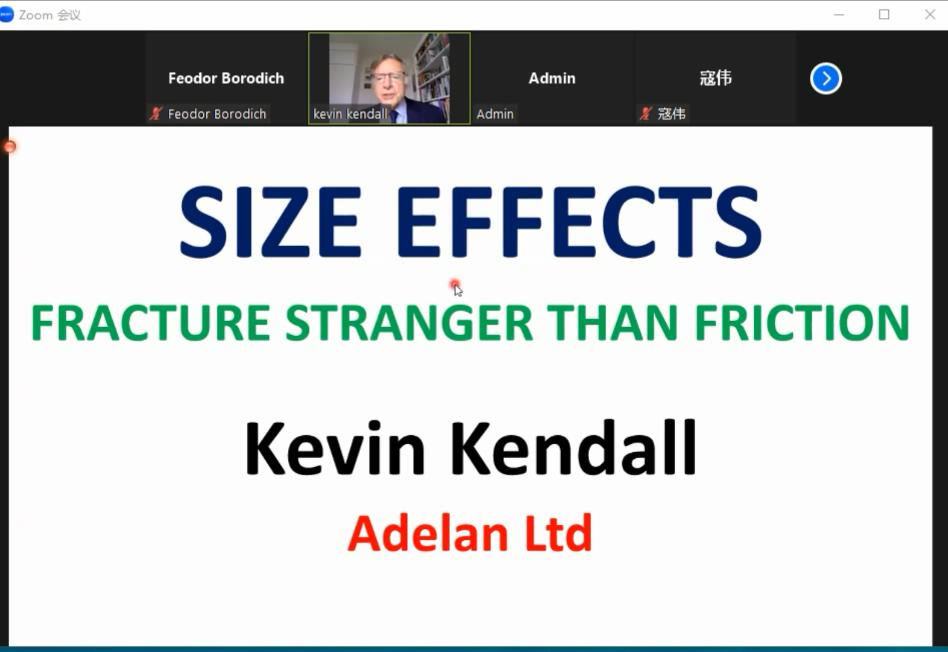 首先,俄罗斯科学院外籍院士Fedor Borodich教授介绍了本次讲座的安排及嘉宾背景。Kendall院士是英国皇家学会院士(FRS),与K. L. Johnson、A. D. Roberts共同提出了著名的JKR粘附接触理论。据谷歌学术统计,JRK模型的原始论文(单篇)迄今已经被引用9300多次。