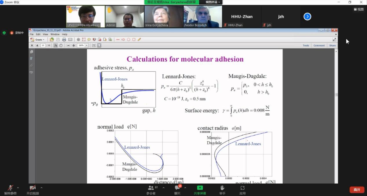 “力学交叉融合”全球前沿学科系列讲座第一期在线召开。本次讲座邀请了俄罗斯科学院(RAS)资深院士、接触力学和摩擦学领域的世界顶级专家Irina Goryacheva教授开展了主题为“Modeling the surface microgeometry and adhesion effects in contact interaction of deformable bodies”的学术讲座,受到包括av01